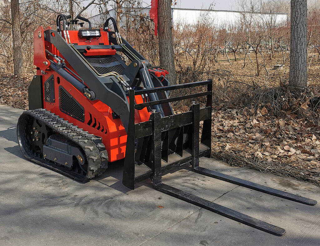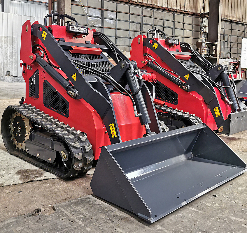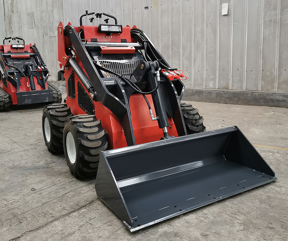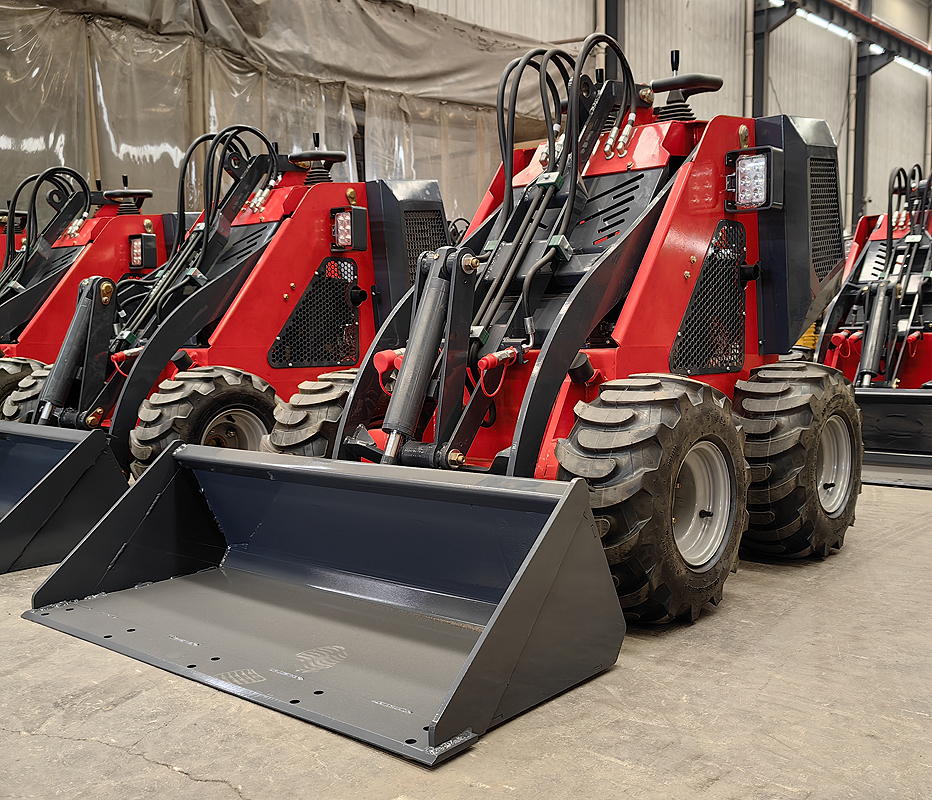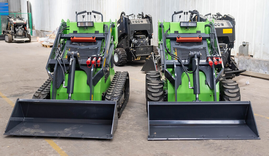 Miniładowarki mogą być wyposażone zarówno w 4 pneumatyczne koła lub w gąsienice (do wyboru, nie ma to wpływu na cenę).